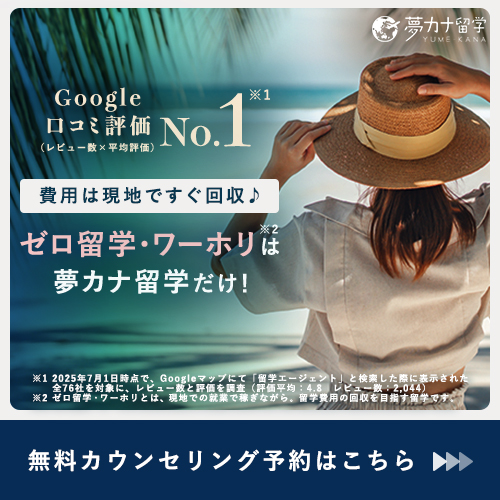 また、夢カナ留学は「ゼロ留学・ゼロワーホリ」というキャッチコピーで近年注目を集めています。この「ゼロ留学・ゼロワーホリ」についても記事の中で紹介していきます。